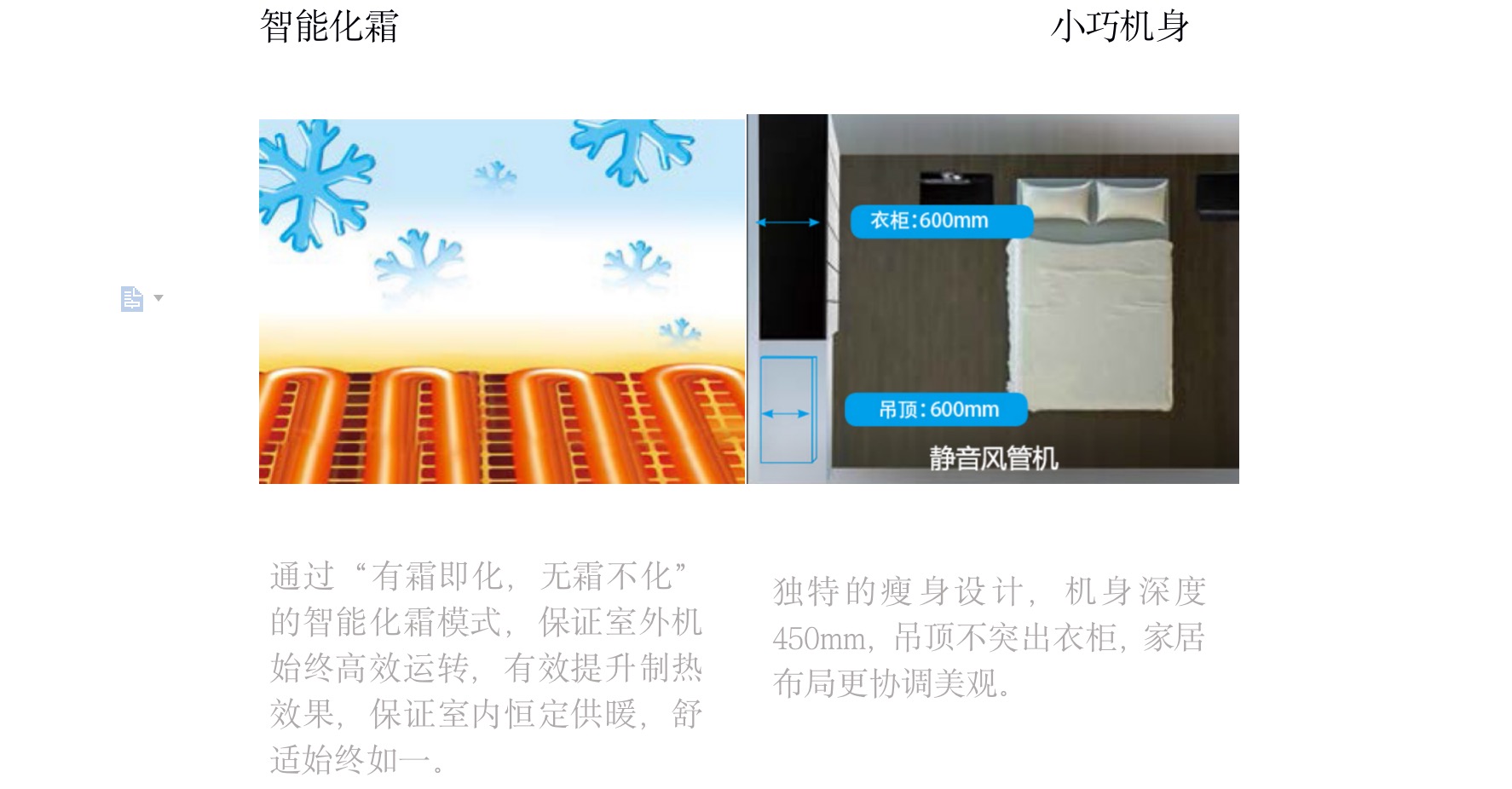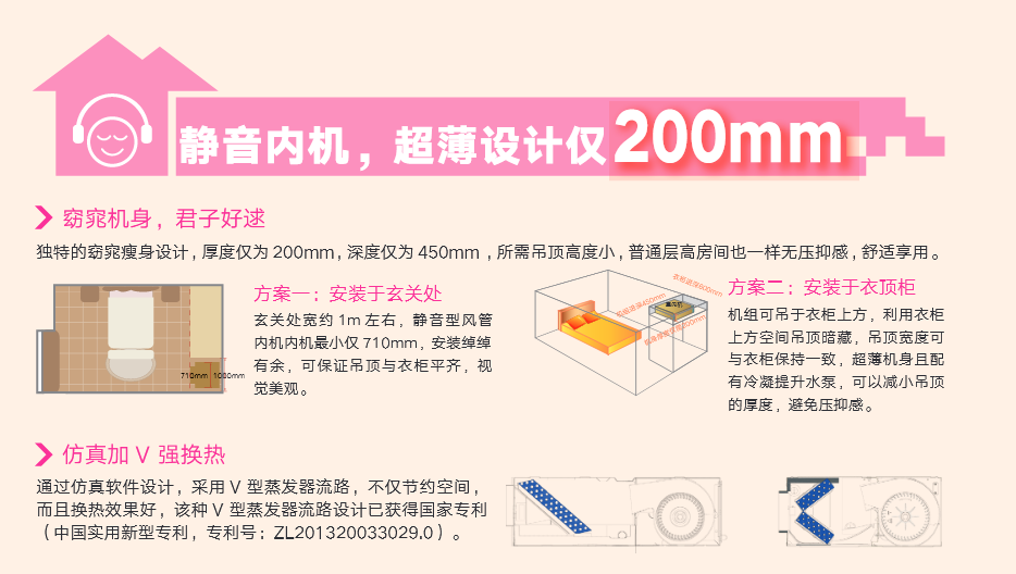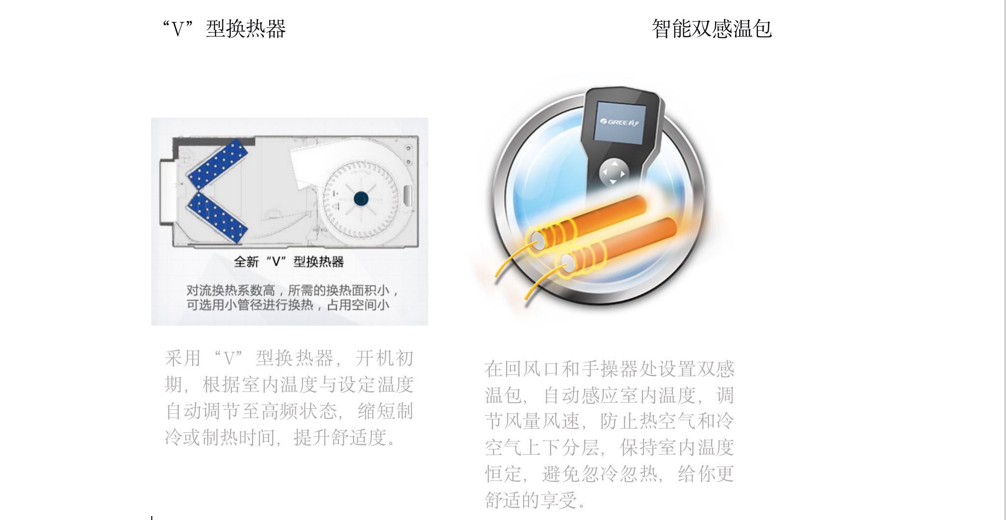 采用“V”型換熱器,開機(jī)初期,根據(jù)室內(nèi)溫度與設(shè)定溫度自動(dòng)調(diào)節(jié)至高頻狀態(tài),縮短制冷或制熱時(shí)間,提升舒適度